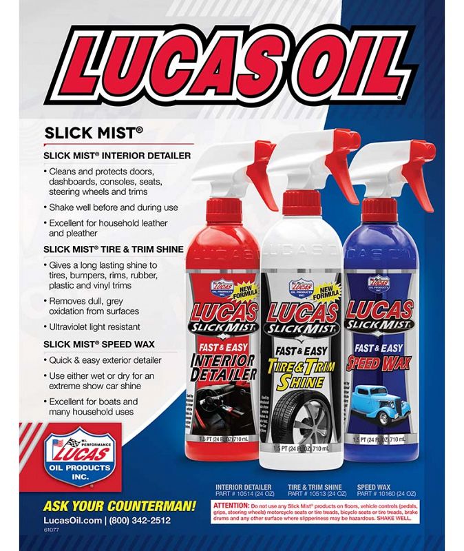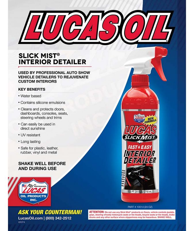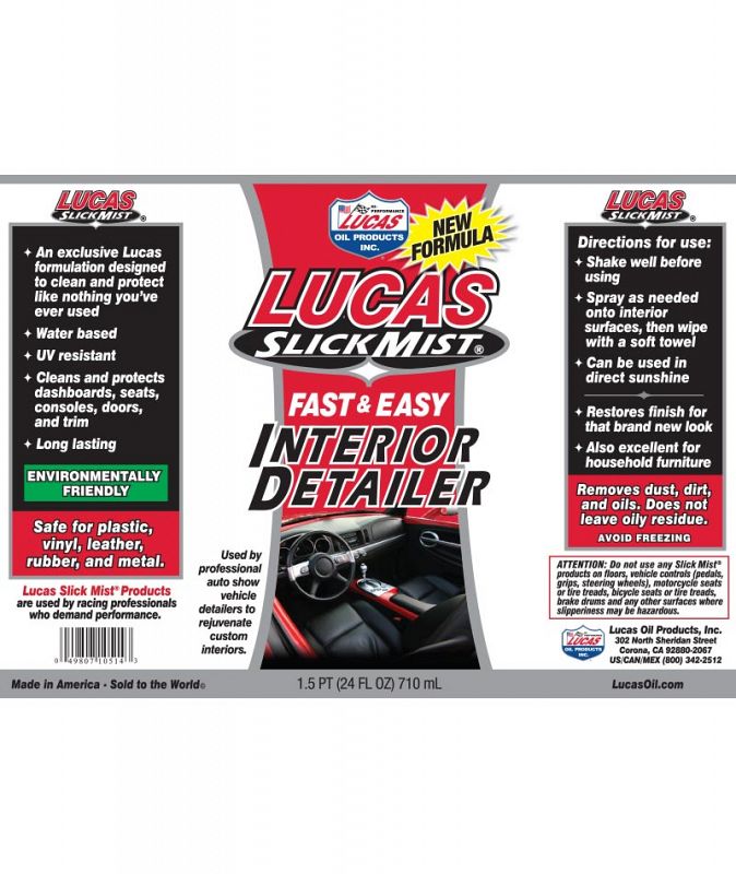 Lucas Slick Mist Interior Detailer is a spray treatment exclusively formulated by Lucas Oil Products designed to clean and protect like nothing you’ve ever used. Spray as needed onto interior surfaces such as plastic, vinyl, leather, rubber and metal for a “like-new” look. Cleans and protects, dashboards, consoles, doors and trim. Also works great on household furniture.