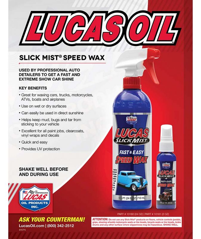 Lucas Oil Slick Mist is a polymer paint gloss intensifier, which can be used on other surfaces such as glass, chrome and vinyl decals. Use Slick Mist as a traditional wax, quick detail spray or spray it on your vehicle between rinsing and drying for the easiest polish job ever. That’s right! Just spray it on a wet or dry surface and wipe it off. Slick Mist out performs the competition and will leave your finish slicker and shinier than any product on the market, with long lasting protection. You and Slick Mist can give any machine an extreme gloss fast!