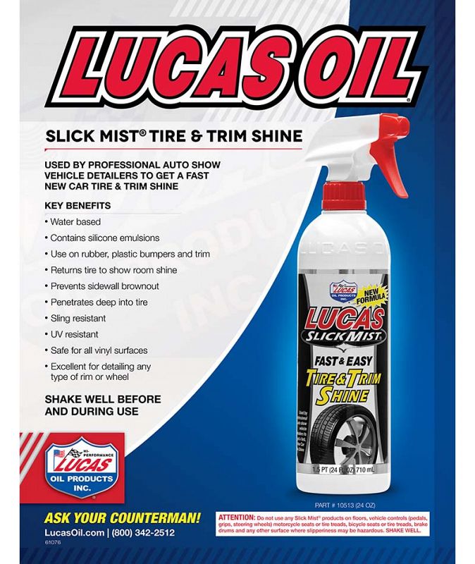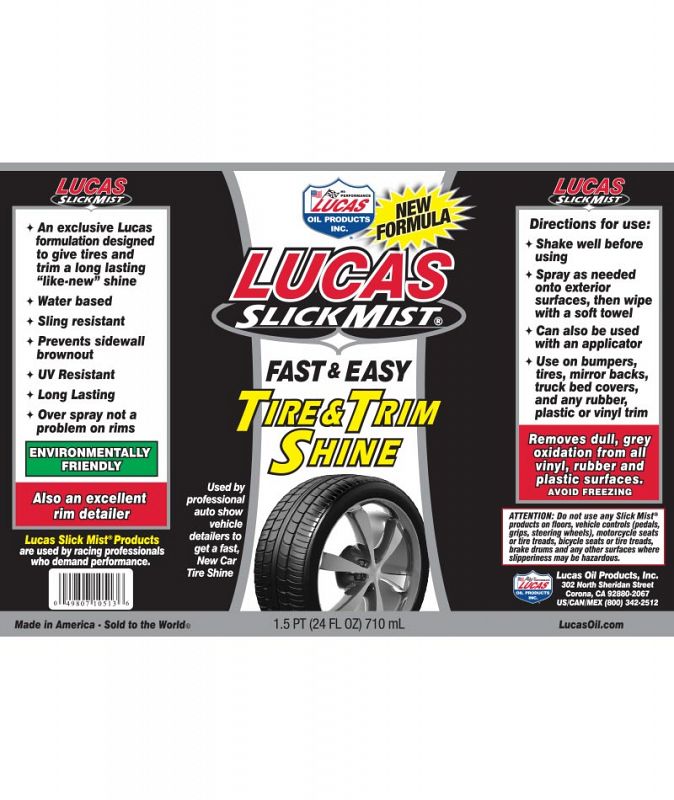 Lucas Slick Mist Tire & Trim Shine is a treatment spray exclusively formulated by Lucas Oil Products designed to give Tires and Trim a long lasting “like-new” shine. Use Slick Mist Tire Shine to remove dull, grey oxidation from Bumpers, Tires, Plastic, or any Rubber and Vinyl Trim.