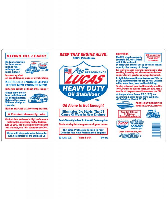 Lucas Oil Stabilizer is a 100% petroleum product formulated to eliminate dry starts and reduce friction, heat and wear in any type of engine. It allows motor oils a higher degree of lubricity which reduces oil consumption and operating temperatures. Use Lucas Oil Stabilizer in gear oil to stop leaks, reduce operating temperatures and increase the life of the gear oil. Since it is pure petroleum, it can safely blend with all other automotive lubricants, even synthetics, ATF and mineral oil. It keeps old engines alive and new engines new.
