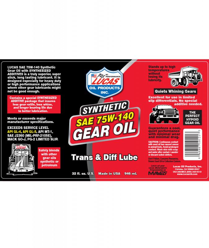 Lucas Pure Synthetic Gear Oils are super-slick, long lasting lubricants designed especially for heavy duty or high performance applications where regular gear lubricants just aren't good enough. They contain a special additive package that increases lubricity and insures less gear noise and longer bearing life. Designed to stand up to high temperatures without losing its lubricity. Excellent for use in limited slip differentials.