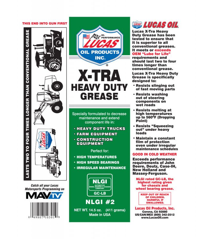 Lucas X-TRA Heavy Duty Grease was formulated for automotive, agricultural, heavy-duty and industrial applications. It is virtually waterproof and is more stable than all conventional lithium grease. It is fortified with an extreme pressure additive package and it exceeds OEM Lube for Life specifications.