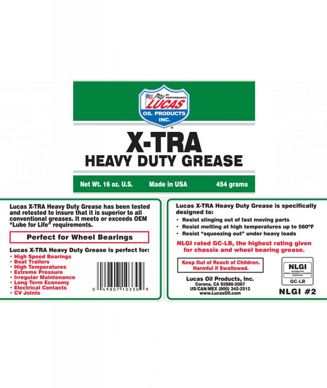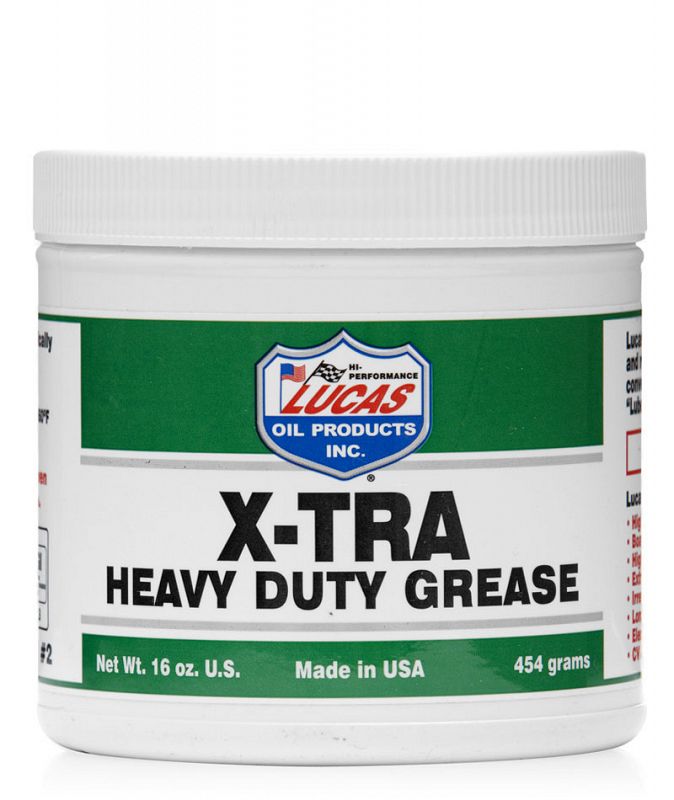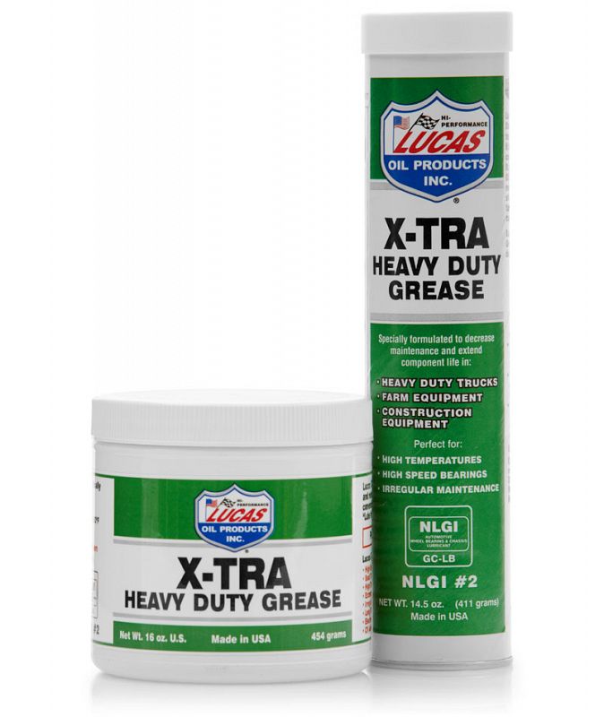 Lucas X-TRA Heavy Duty Grease was formulated for automotive, agricultural, heavy-duty and industrial applications. It is virtually waterproof and is more stable than all conventional lithium grease. It is fortified with an extreme pressure additive package and it exceeds OEM Lube for Life specifications.