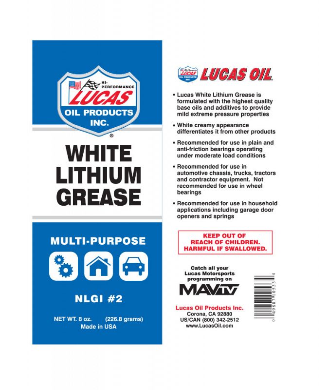 Lucas White Lithium Grease is a Multi-Purpose high quality NLGI #2 formulation. White and creamy in appearance, the White Lithium Grease resist extreme pressure properties and is recommended for everything from household applications, to a variety of automotive uses including chassis, trucks, tractors, and contractor equipment. Not recommended for use in wheel bearings.