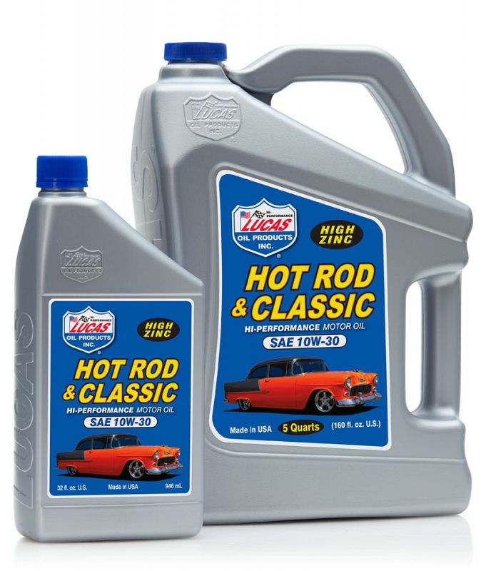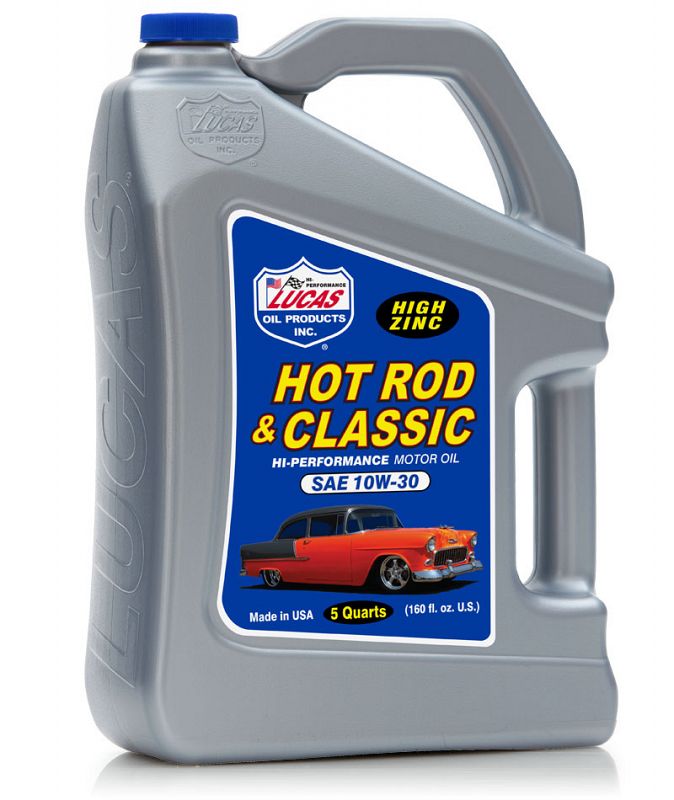 Lucas Hot Rod & Classic Car Motor Oil SAE 10W-30 is manufactured with the highest quality paraffinic base oils and is fortified with a unique additive package containing high levels of zinc, molybdenum and phosphorus, which provides a tougher, thicker additive film for maximum protection even under the most severe conditions. It improves the film strength between the cylinder wall and piston rings and slows oil burning and improves pressure in worn engines. It has good cold temperature properties and stands up to high operating temperatures. It is compatible with methanol and all racing fuels, as well as with synthetic and non-synthetic oils.