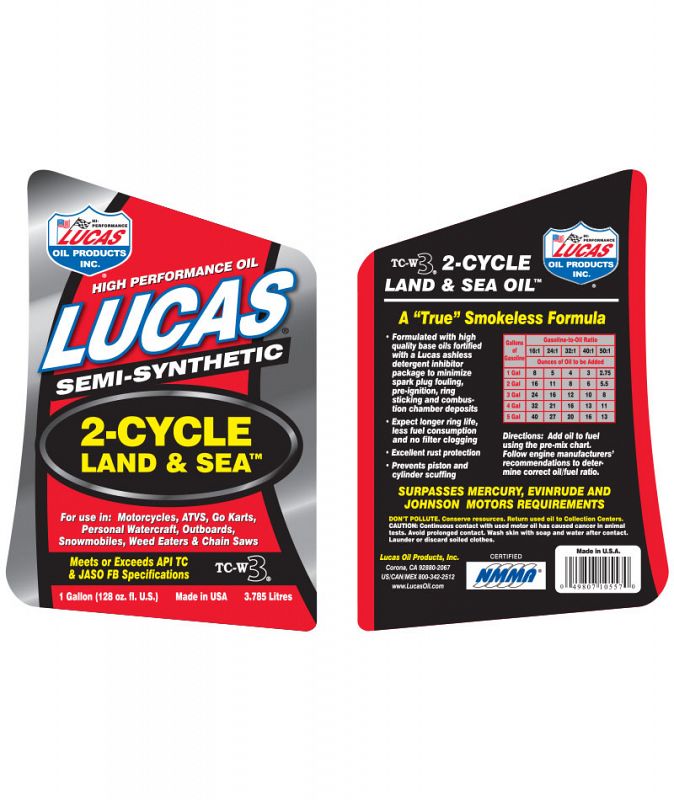 A "TRUE" Smokeless Formula, Lucas 2-Cycle Land & Sea Oil TC-W3 is specially formulated with high quality base oils fortified with a Lucas ashless detergent inhibitor package to minimize spark plug fouling, pre-ignition, ring sticking and combustion chamber deposits. For more specific information on each racing oil please review our product specification sheets.