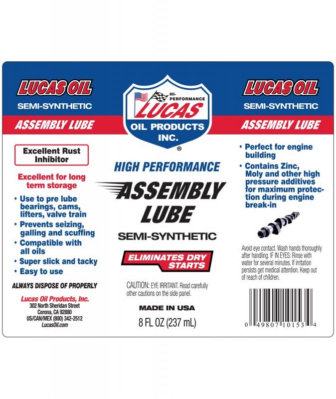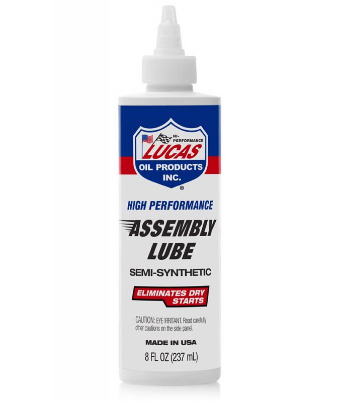 Lucas High Performance Assembly Lube is designed for mechanics and technicians to pre lube bearings, cams, lifters and valve train. The Semi-Synthetic formula contains ZINC, MOLY and other high pressure additives which offer maximum protection during engine break-in. Super slick and easy to use, Lucas High Performance Assembly Lube will eliminate dry starts and prevent seizing galling and scuffing.