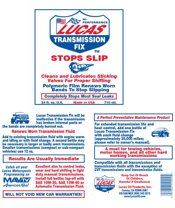 Lucas Transmission Fix is a non-solvent formula that stops slip, hesitation and rough shifting in worn transmissions and completely eliminates most seal leaks. Use in any transmission for preventative maintenance. Use also in light duty manual transmissions to increase shifting ease and transmission life.