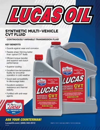 Lucas Synthetic Multi-Vehicle CVT Fluid is a premium, full synthetic transmission fluid specifically designed for use in passenger cars with steel belt-driven or chain continuously variable transmissions. Lucas CVT Fluid guards against wear & corrosion. It resists shear thinning better than typical CVT fluids. Lucas CVT Fluid provides superior cooling, & excellent low-temperature fluidity for smoother operation in cold weather.